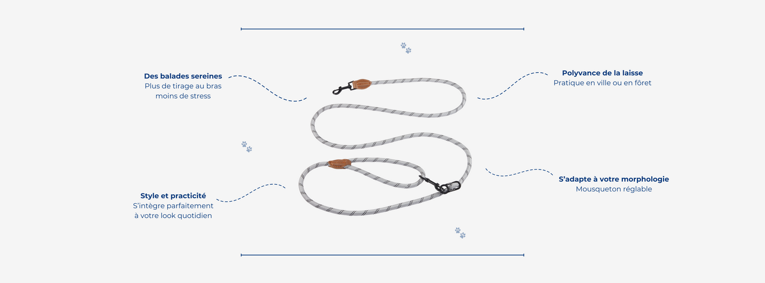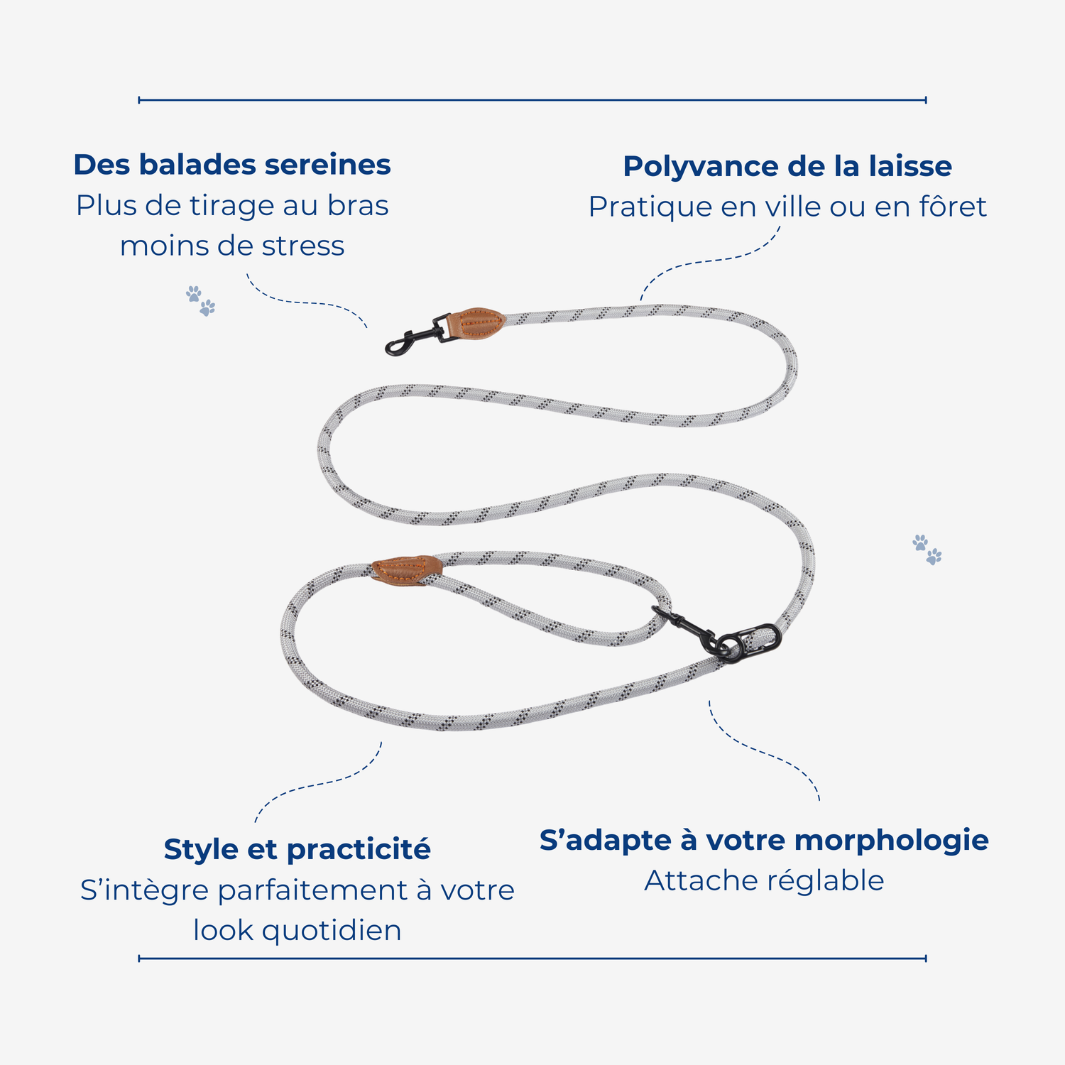 - Style : Une laisse qui s'intègre parfaitement à votre look quotidien, que ce soit pour une balade en ville ou en forêt